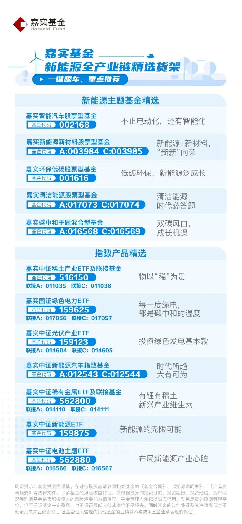 被動指數(shù)產(chǎn)品方面,在新能源新材料方向,嘉實(shí)基金體系化布局了包括上游材料端的稀土ETF嘉實(shí)(516150)及聯(lián)接、稀有金屬ETF(562800)及聯(lián)接;發(fā)電端的光伏ETF嘉實(shí)(159123)及聯(lián)接、綠色電力ETF(159625)及聯(lián)接;儲能及用電端的電池ETF嘉實(shí)(562880)及聯(lián)接、嘉實(shí)中證新能源汽車指數(shù)(012543),以及跟蹤新能源產(chǎn)業(yè)整體表現(xiàn)的新能源ETF(159875)等等,全面覆蓋新能源行業(yè)的各領(lǐng)域。